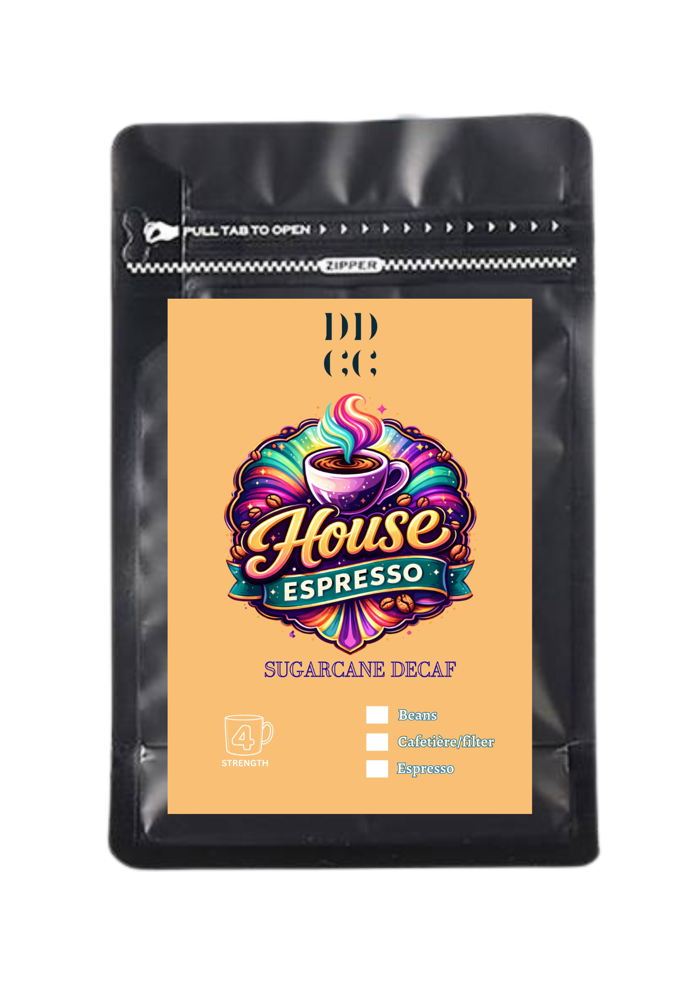 Our House Decaf Espresso is a carefully crafted blend of sugarcane decaffeinated coffees from Brazil and Papua New Guinea. Designed to deliver a beautifully clean and balanced cup.